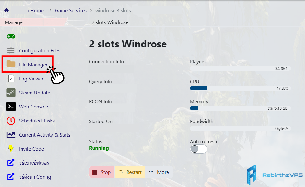 2.เข้าหน้าบริการเกมแล้วทำการคลิกที่ File Manager/จัดการไฟล์