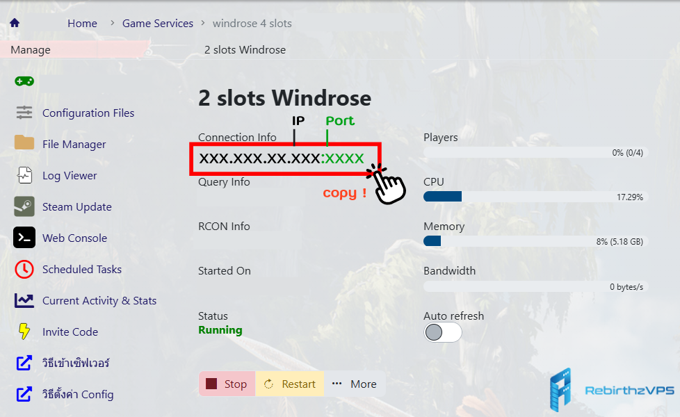 กลับมายังหน้าหลักให้ทำการ Copy “Connection Info” (IP:Port)